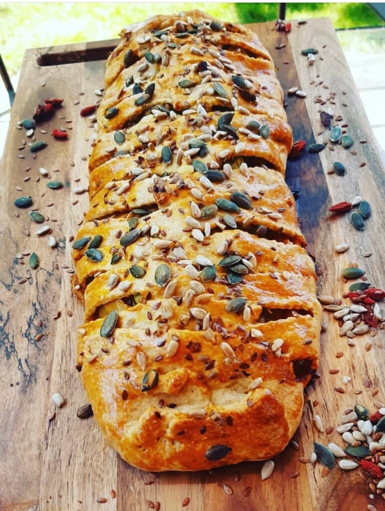 Ensuite, badigeonnez la surface avec un jaune d’œuf et enfin ajoutez les graines sèches variées. Terminez en enfournant à 180 degrés pendant environ une demi-heure.