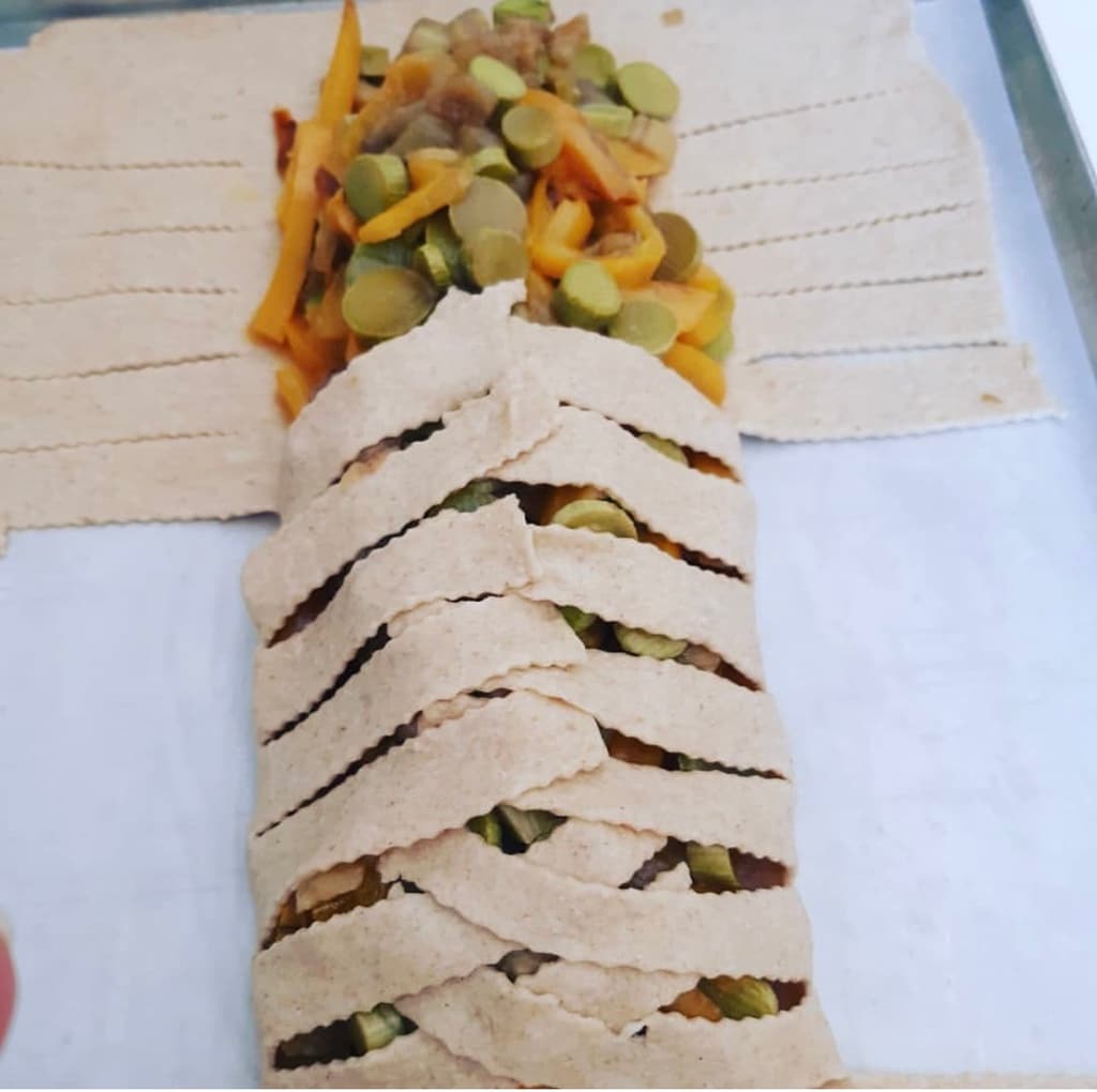 Puis, avec la roulette, coupez les 2 extrémités en lanières, comme sur la photo, après avoir déposé la garniture au centre de la pâte. Ensuite, enveloppez la garniture avec les lanières.