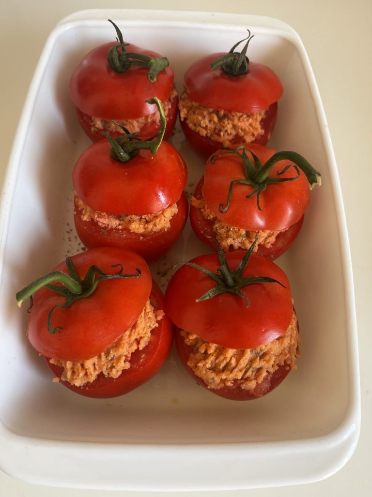 À ce stade, nos tomates sont prêtes à être farcies. Faisons déborder la farce, ajoutons le chapeau de la tomate que nous avons mis de côté précédemment et