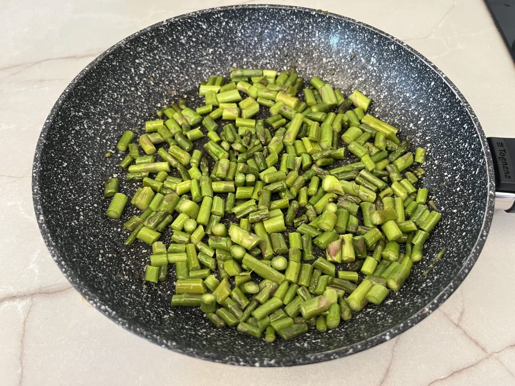 Lave soigneusement les asperges sous l’eau courante, plie la tige : elle se cassera au bon endroit et coupe-les en rondelles sur une planche à découper. Hache un demi-oignon avec un hachoir. Graisse une poêle d’huile, fais chauffer et fais revenir l’oignon haché avec les asperges pendant environ deux minutes en les tournant de chaque côté