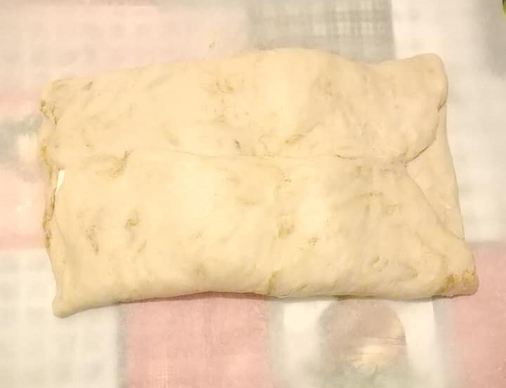 Placer la pâte au réfrigérateur pour reposer pendant 30 minutes. Reprendre la pâte et plier un bord sur un quart et l’autre bord jusqu’au précédent plié. Replier la pâte sur elle-même