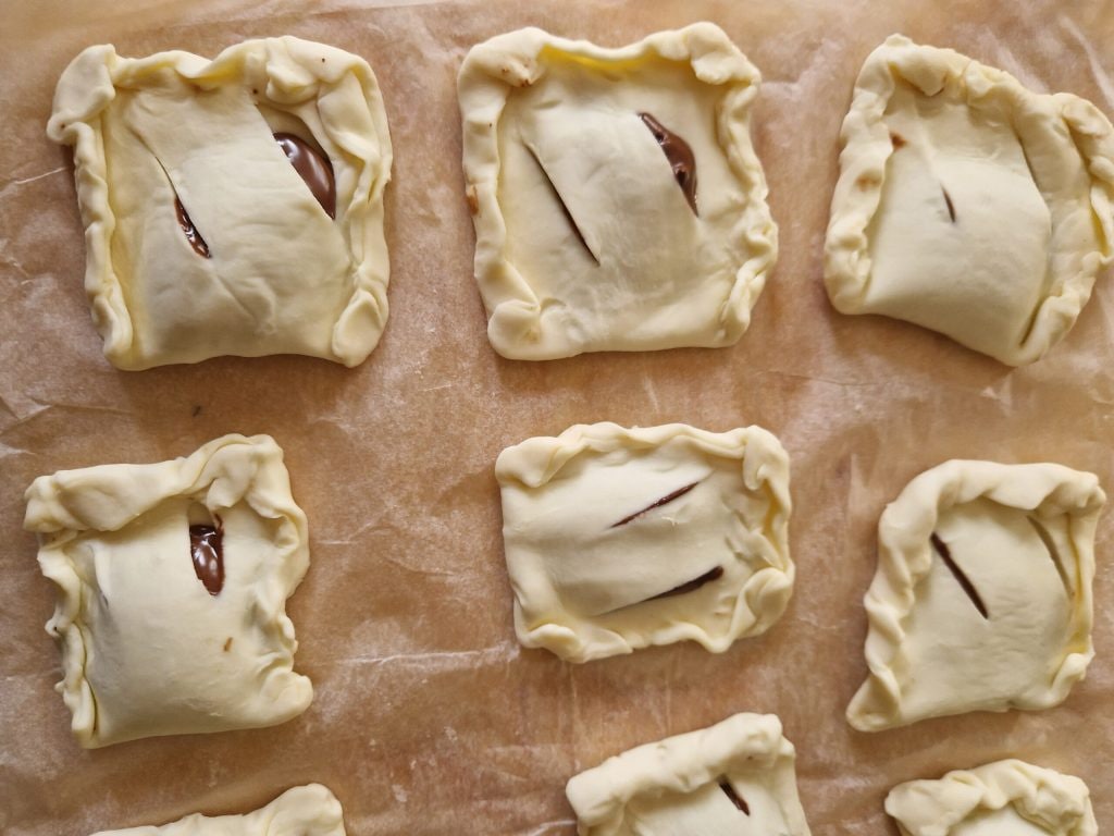 Disposez les biscuits de pâte feuilletée au chocolat sur une planche farinée au fur et à mesure que vous les réalisez, ou sur du papier sulfurisé,