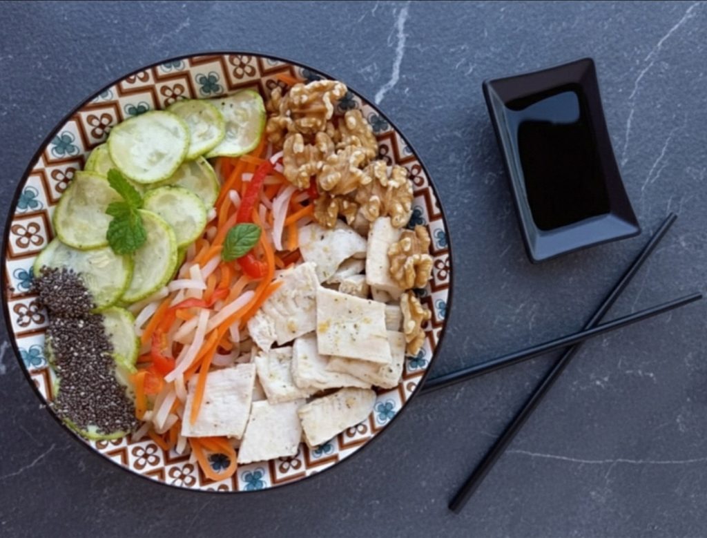Composons le plat: mettez le riz au fond du bol. Puis faites des bandes de poulet, de légumes au vinaigre, de courgettes en carpaccio, de noix et de graines de pavot, arrosez le tout de sauce soja et d’huile d’olive