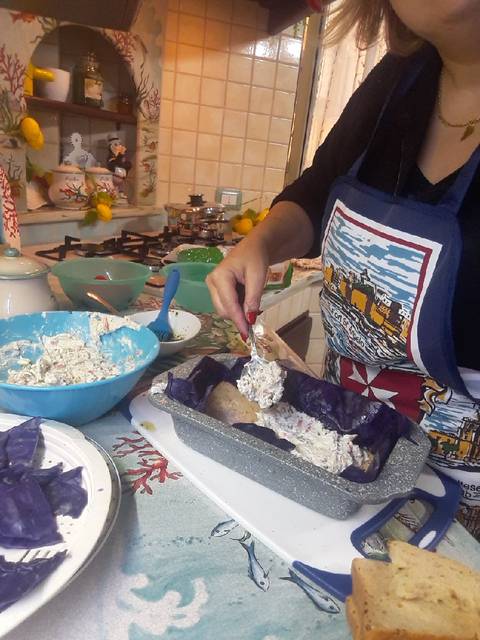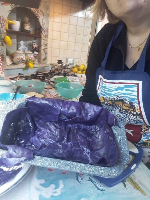 Puis tapisse le moule avec les feuilles de chou rouge.