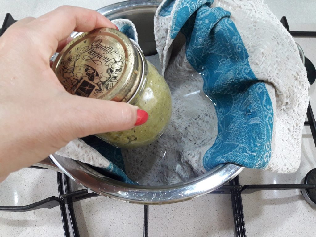 Répartissez le pesto de brocolis dans les bocaux, préalablement stérilisés.