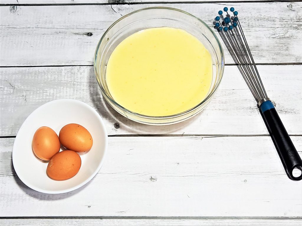 Entre-temps, à part, avec les fouets d’un batteur électrique ou d’un robot culinaire, montez les jaunes d’œufs et le sucre, jusqu’à obtenir un mélange gonflé et mousseux. Puis ajoutez l’amidon de maïs ou de riz si vous êtes intolérant au gluten, et travaillez encore.