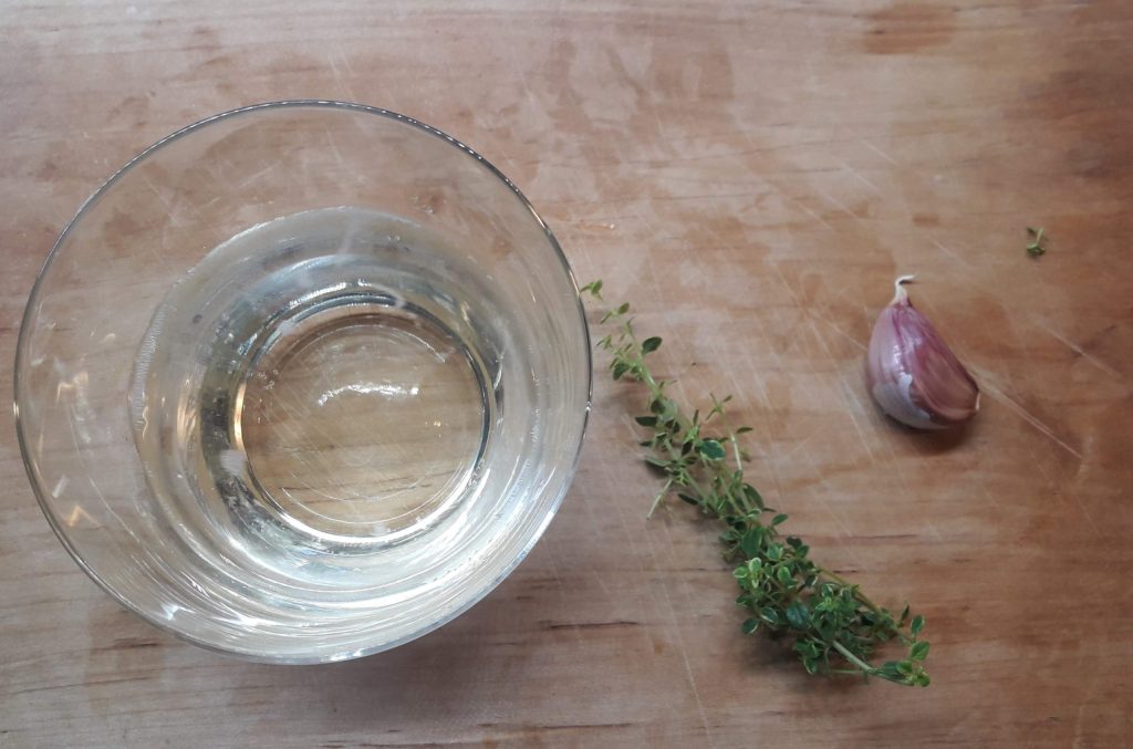 Épluchez l’ail en le laissant entier, lavez le thym citronné et préparez le vin blanc