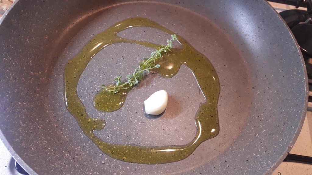 Dans une poêle antiadhésive, mettez un peu d’huile d’olive, l’ail et un peu de thym.