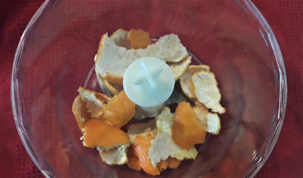 Épluchez les mandarines ou les clémentines, mettez de côté le fruit et hachez la peau