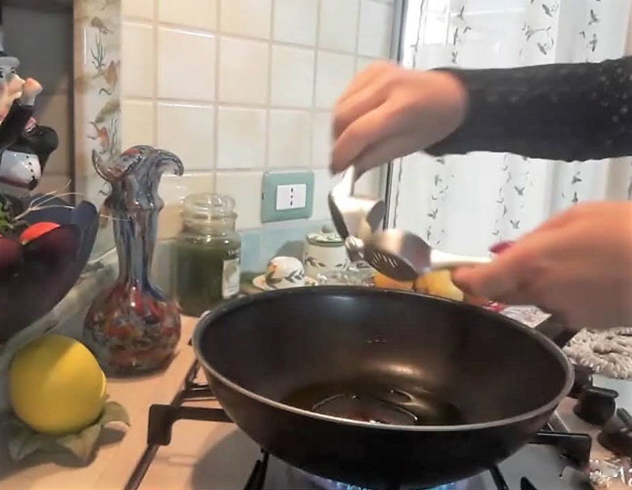 Entre-temps, dans un wok, mettez un filet d’huile d’olive extra vierge, et une gousse d’ail bien hachée. Faites revenir un instant, et…