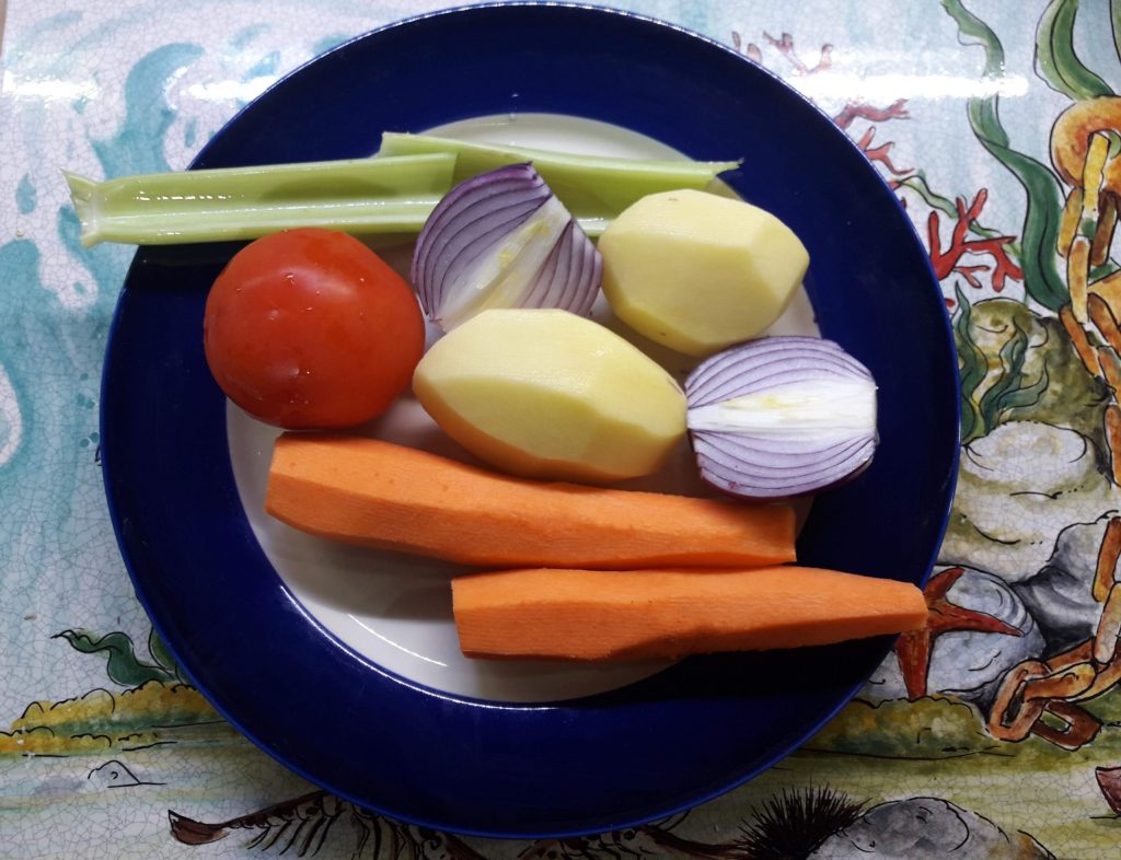 Ajouter entiers : la moitié de l’oignon, des carottes, et du céleri, puis toutes les pommes de terre et les tomates, tous ces légumes doivent être entiers,
