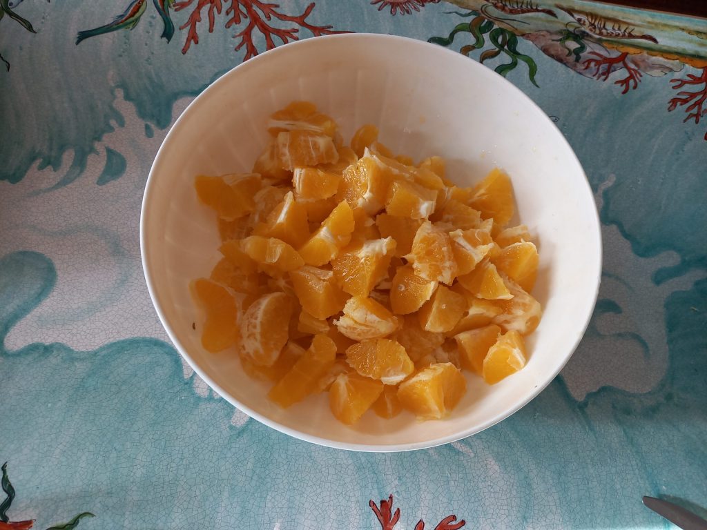 • Ensuite, coupez les oranges, d’abord en deux, enlevez le pédoncule blanc à l’intérieur, et les pépins, puis coupez chaque quartier en plusieurs parties.