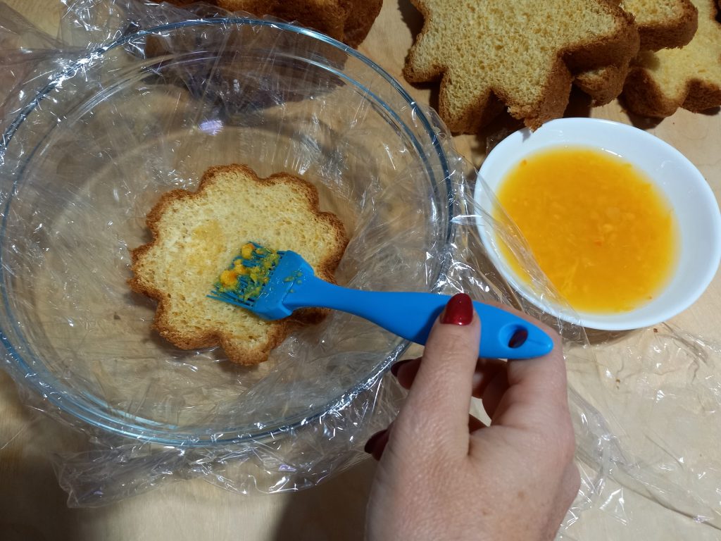 Ajoutez les morceaux de pandoro qui vous restent, sauf la grande base, et badigeonnez-les aussi avec le sirop,