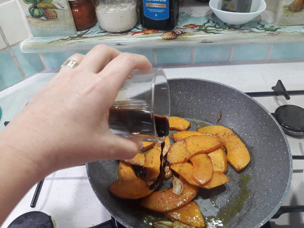 • Augmente le feu, saute la courge dans la poêle et fais évaporer tout l’alcool. À la fin, ajuste le sel.