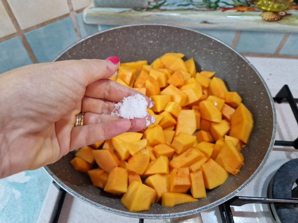 faites-la cuire dans une poêle antiadhésive avec l’huile et une gousse d’ail hachée et une petite pincée de sel, à feu moyen, pendant environ 15 minutes.