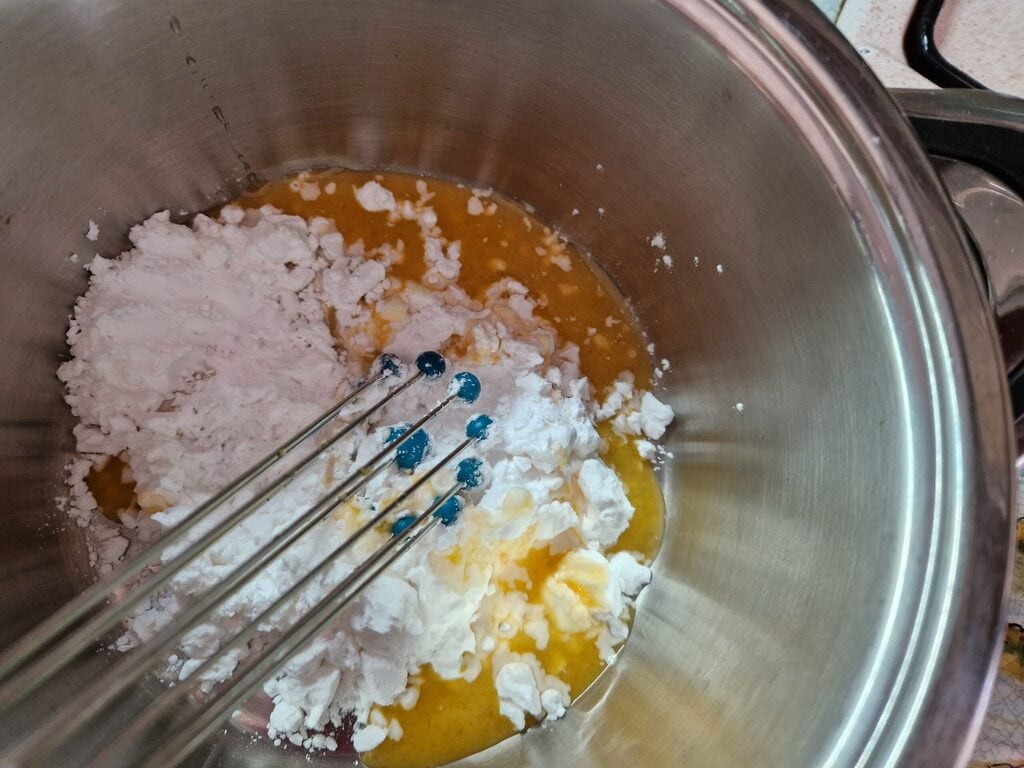 Avec une fourchette ou un fouet, mélangez ce mélange pour éviter la formation de grumeaux.