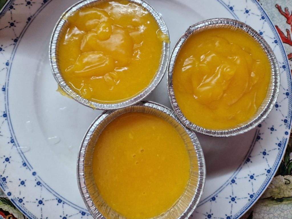 Éteignez maintenant le feu, humidifiez des moules avec de l’eau et versez la gelée de mandarines dans 8 moules.