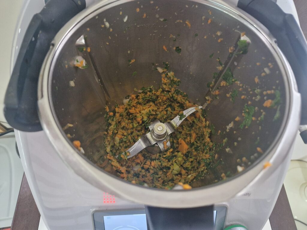 Mettez dans le bol l’oignon, la carotte et le céleri grossièrement hachés, et hachez pendant 10 sec vitesse 8.