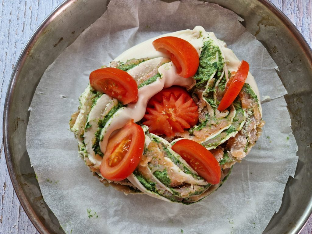 Sur une plaque avec du papier sulfurisé en dessous, nous posons délicatement la tresse de pâte feuilletée saumon et épinards, nous posons ensuite dessus des tomates cerises pour la décoration,