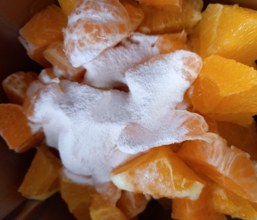 Pendant que le gâteau cuit, lavez le bol et mettez les mandarines coupées dedans avec le sucre ou l’édulcorant.