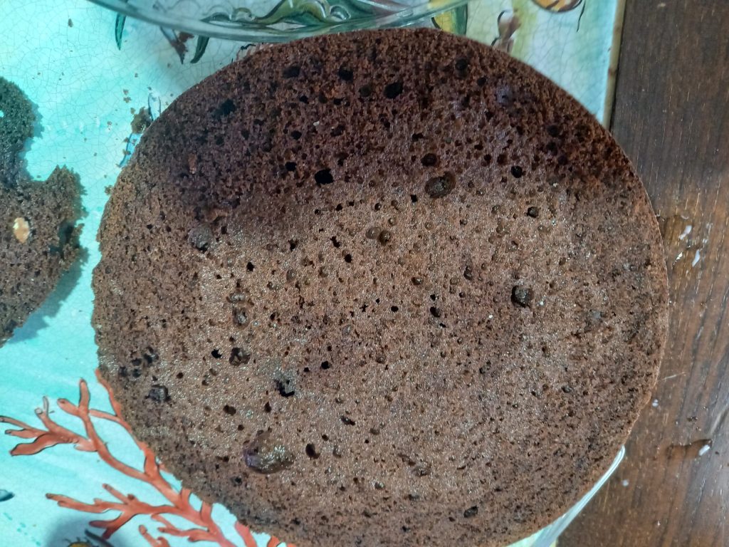 Placez le premier disque sur un plat à gâteau, imbibez-le généreusement avec l’imbibage et versez presque toute la crème en laissant environ 4-5 cuillères pour la décoration finale.
