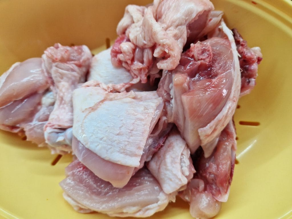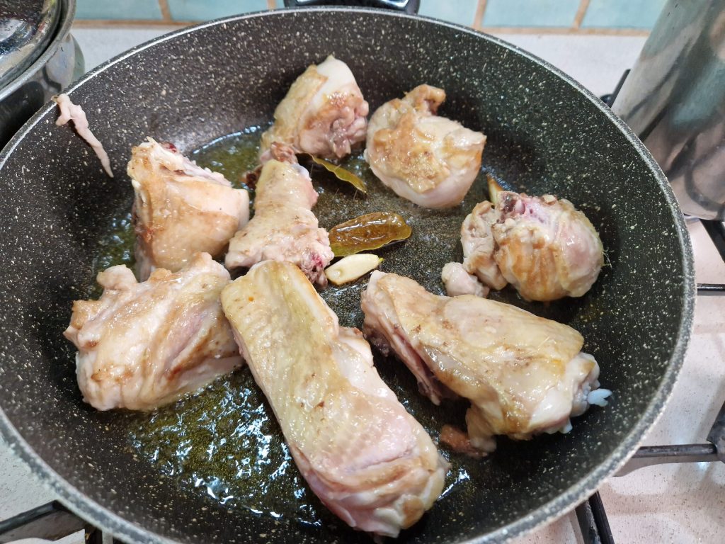 Ensuite, retirez les morceaux de poulet de la poêle et faites revenir l’huile restante avec le hachis d’oignon et d’ail, une fois bien dorés…