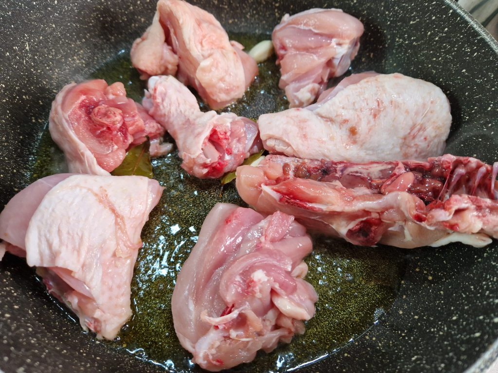 Dans une cocotte ou une grande poêle, faites chauffer la moitié de l’huile avec l’ail, le laurier et la marjolaine, et ajoutez le poulet.