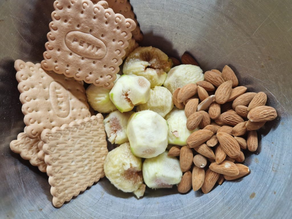 Les figues et les biscuits. Mixez pendant vingt secondes à vitesse huit. Ensuite, rassemblez avec la spatule et éventuellement mixez à nouveau jusqu’à ce que vous atteigniez une certaine crémeux.