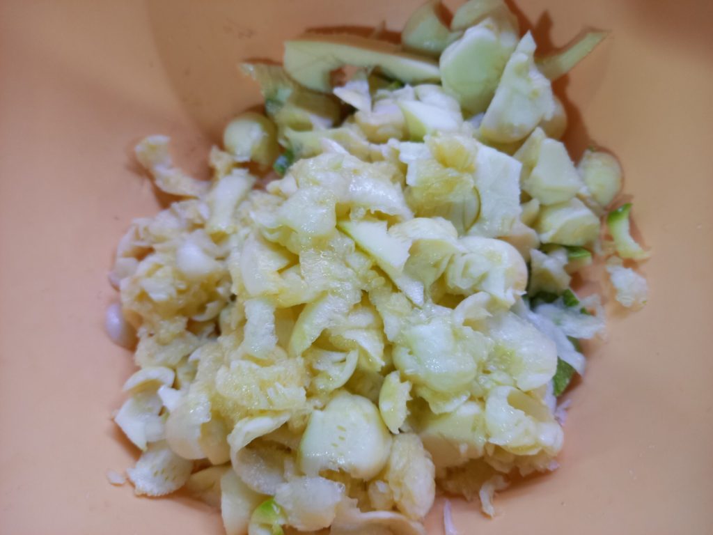 • et hachez au couteau à la fois la chair et le déchet de peau