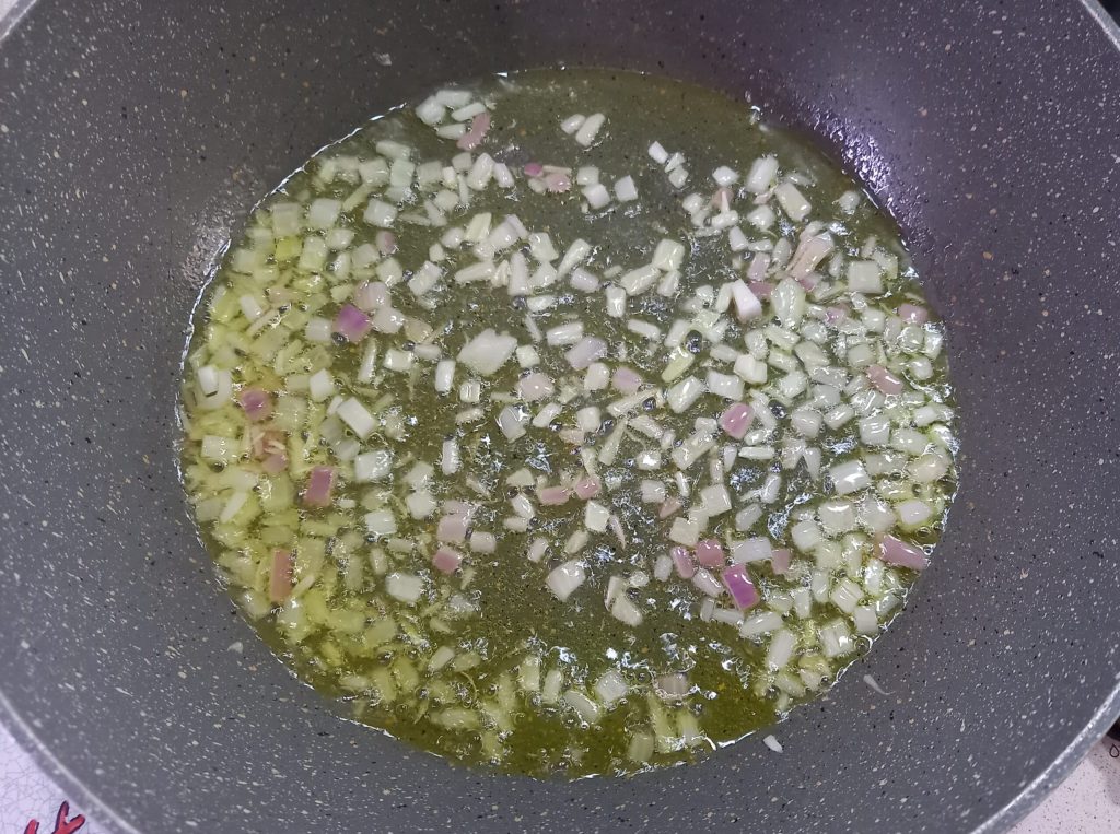 • Prenez une poêle et chauffez l’huile d’olive avec un demi-oignon coupé en morceaux. Si vous n’aimez pas l’oignon, vous pouvez faire revenir une gousse d’ail.