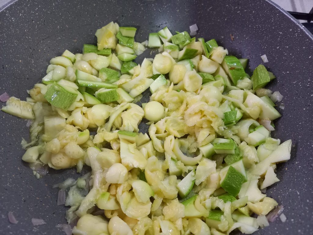 • ajoutez la chair des courgettes et ajustez le sel et le poivre q.b.