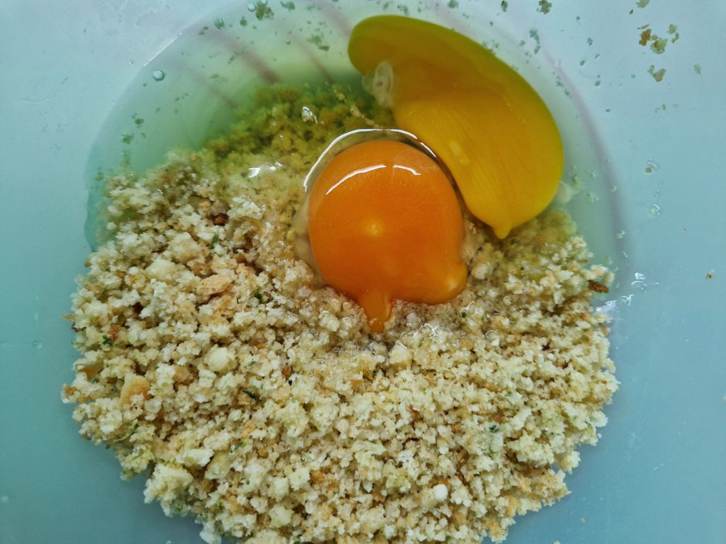 Prenez 1/3 de la chapelure et mettez-la dans un bol à part où vous ajouterez les œufs et vous devez les battre.