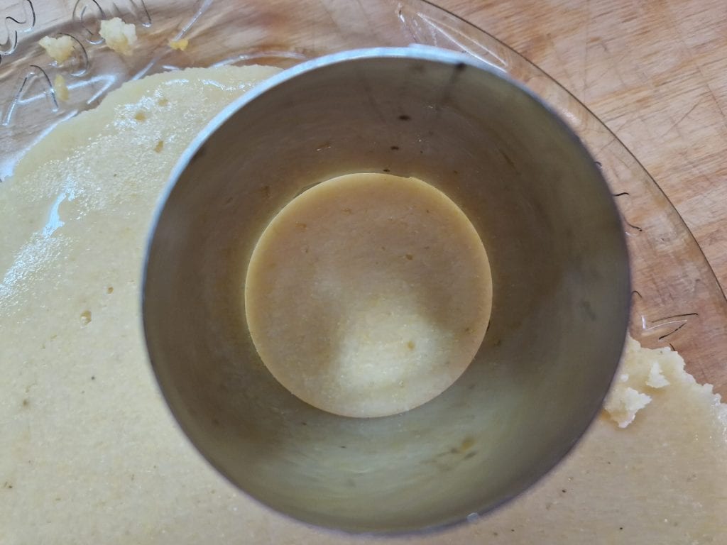 Retournez la polenta désormais solidifiée sur un plan de travail ou une autre assiette, et avec l’aide d’un emporte-pièce de 4 cm, découpez des disques égaux,