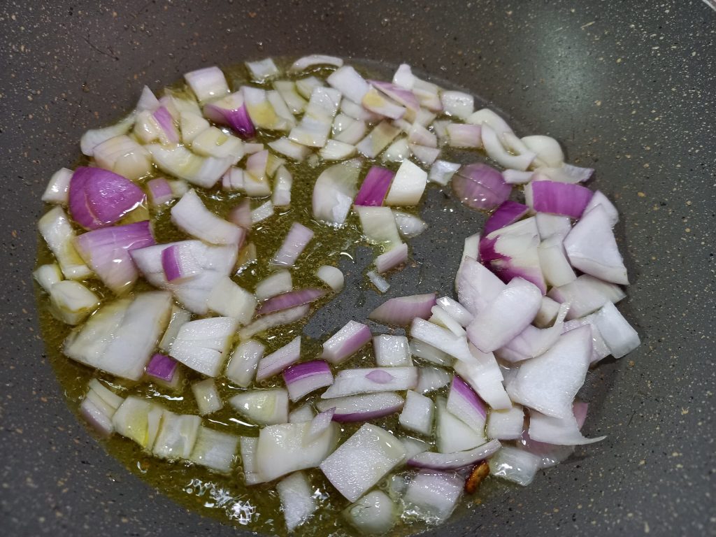 Épluchez l’oignon et coupez-le en morceaux grossiers, mettez-le dans une poêle antiadhésive avec l’huile evo, et faites-le revenir pendant 2 minutes.