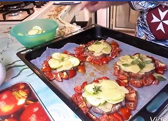 • Disposez sur le poisson des tranches alternées de courgettes et de pommes de terre, et faites cuire au four d’abord à 180 °C ventilé pendant 4 minutes.
