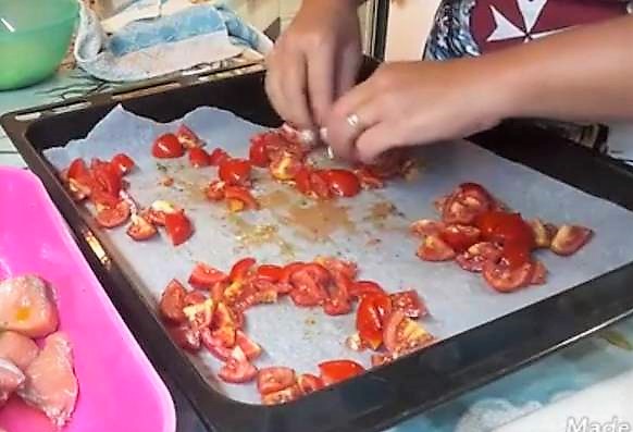 • Dès que tout est coupé et assaisonné, sur une plaque de cuisson, placez une feuille de papier sulfurisé et formez des anneaux avec les tomates cerises.