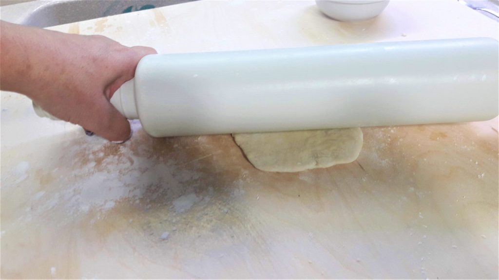 Quand vous avez fini, vous aurez formé un cercle. Bien, maintenant aplatissez avec le rouleau à pâtisserie jusqu’à obtenir une épaisseur d’environ 5 mm.