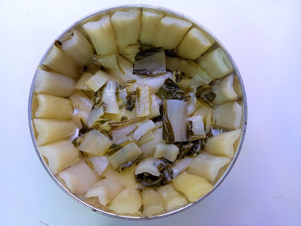 • Nous avons besoin seulement des côtes, donc retirez les feuilles et la partie finale, puis lavez-les.