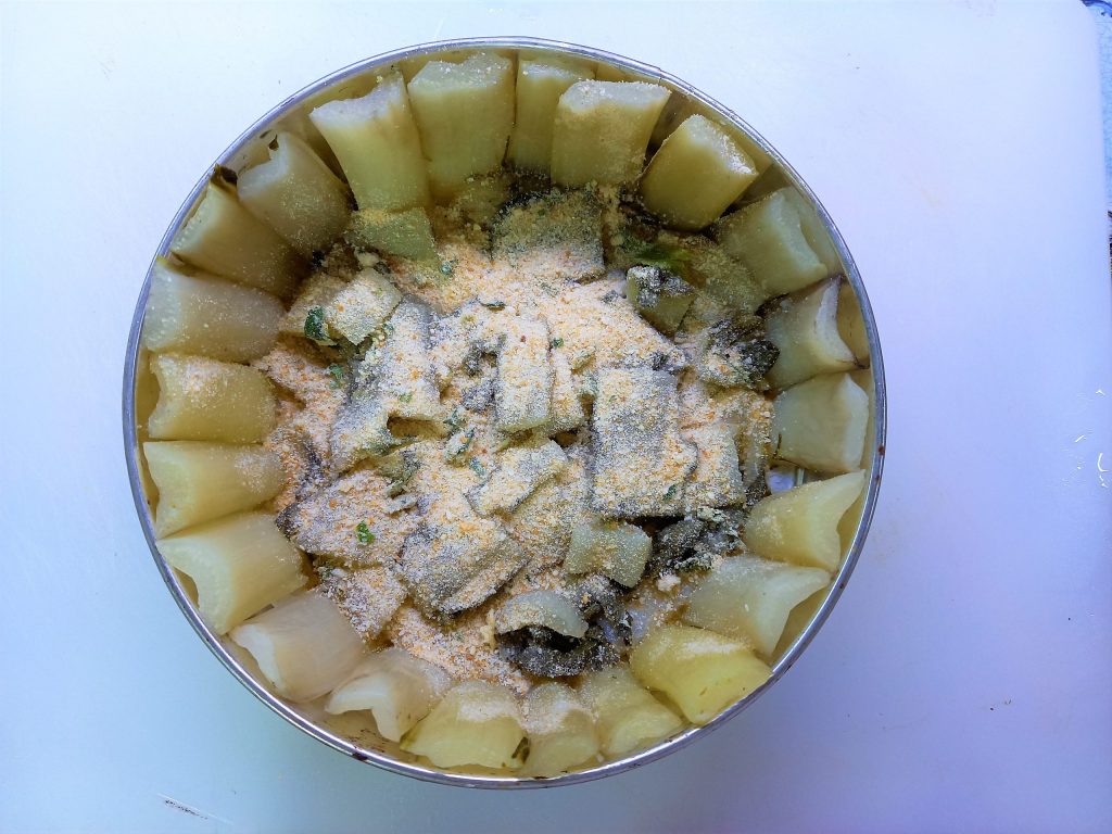 • Tapissez le fond d’un moule à charnière avec du papier sulfurisé, placez sur les bords des côtes de la hauteur du bord du moule, et avec les tronçons, formez le fond.