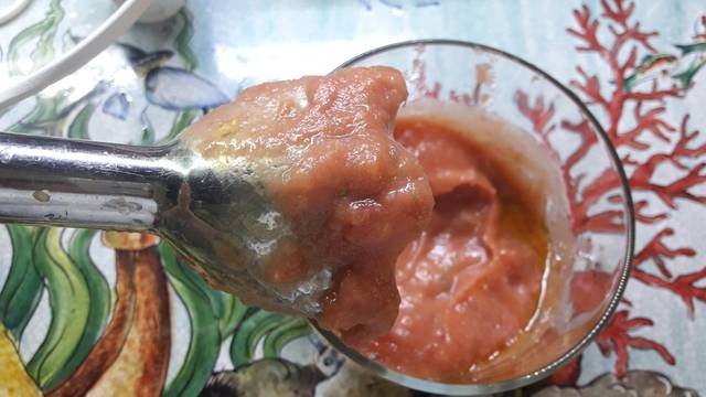 • Mélange le tout puis ajoute le coulis de tomate et 3 cuillères à soupe d’huile d’olive extra vierge.