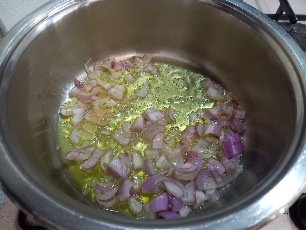 • Épluchez et hachez l’échalote, mettez-la dans une casserole et ajoutez l’huile d’olive extra vierge. Faites revenir quelques minutes.