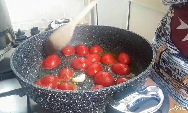 Ajoutez-les à la poêle avec les tomates cerises, mettez une louche d’eau, et couvrez jusqu’à la fin de la cuisson.