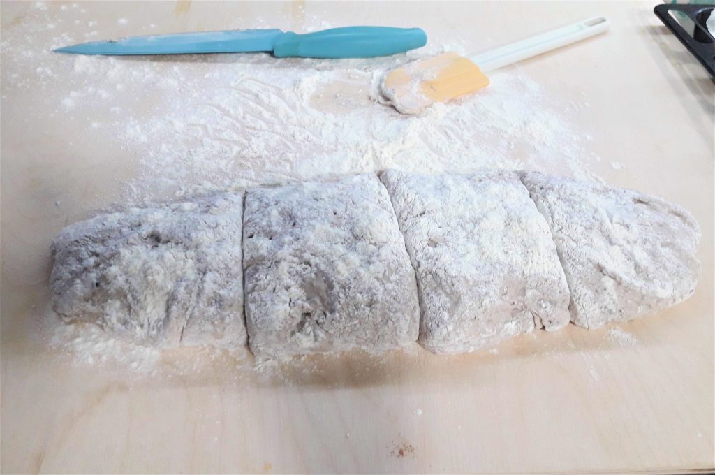 Ajoute les olives en morceaux et avec les morceaux de pâte, forme délicatement des petits pains.