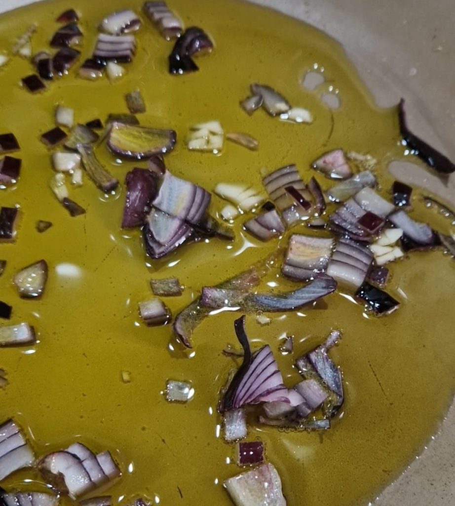 Hachez l’oignon, mettez‑le dans une casserole avec un filet d’huile d’olive extra vierge et laissez‑le fondre,