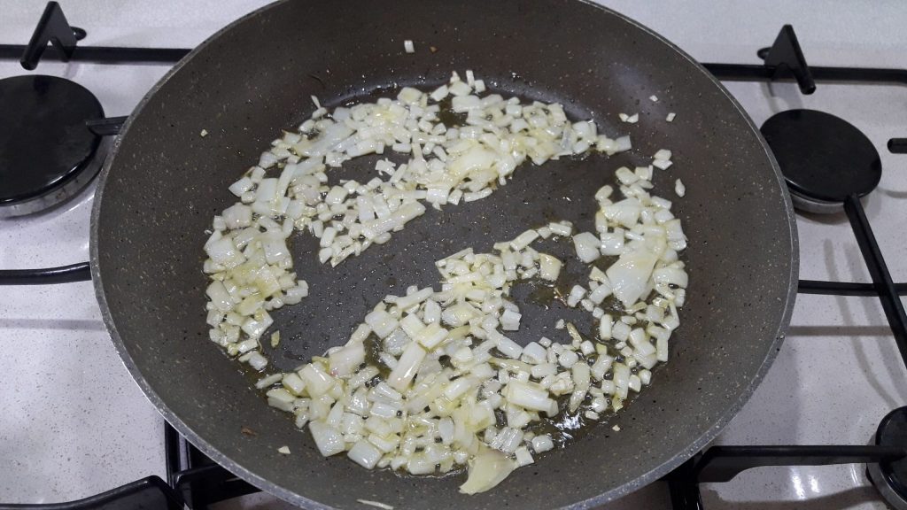 Dans une poêle, mettez l’oignon haché et l’huile que vous avez, et laissez frire pendant au moins 2 minutes, puis…