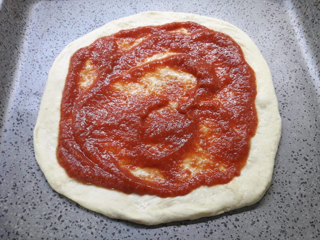 Quand la pâte a levé, allumez le four en mode pizza à 220°. Si vous n’avez pas le mode pizza, mettez-le statique.