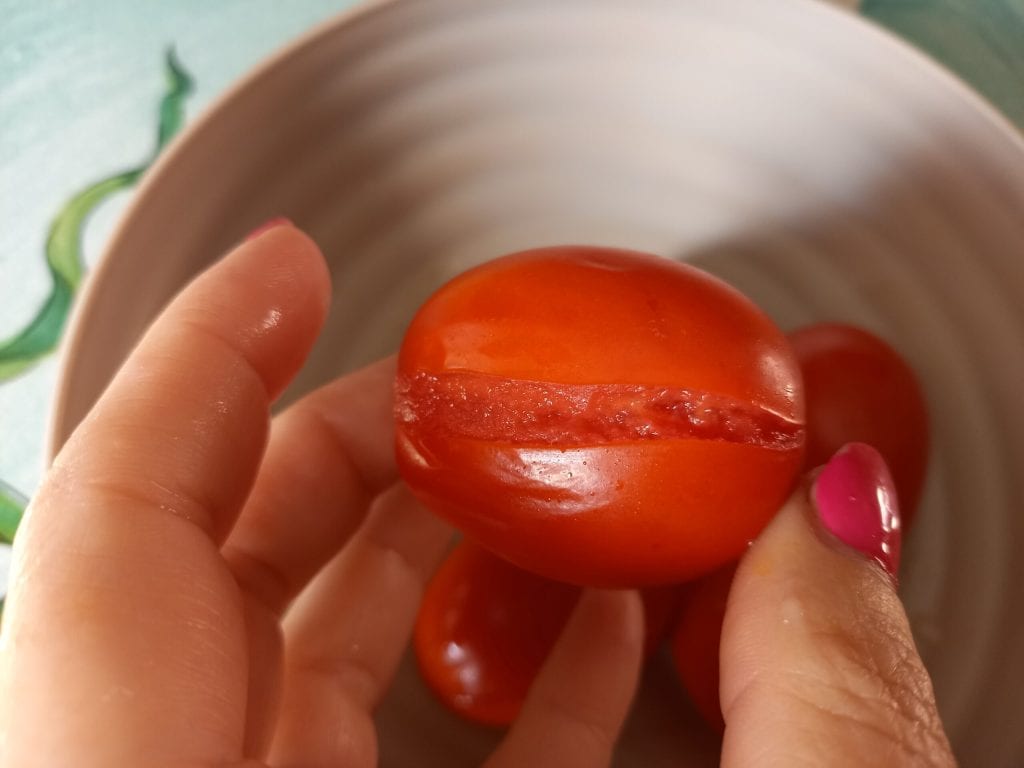 Dans une petite casserole, mettez de l’eau et portez-la à ébullition, incisez la peau des tomates avec un couteau, puis immergez-les et laissez-les dans l’eau bouillante pendant 3 minutes.