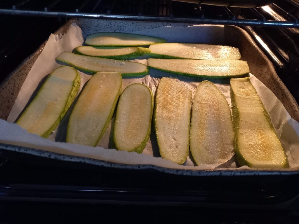 Maintenant passez à la cuisson des tranches. Au four, allumez le four à 200° grill, disposez les tranches de courgette sur une plaque avec du papier sulfurisé et faites cuire 3 minutes de chaque côté
