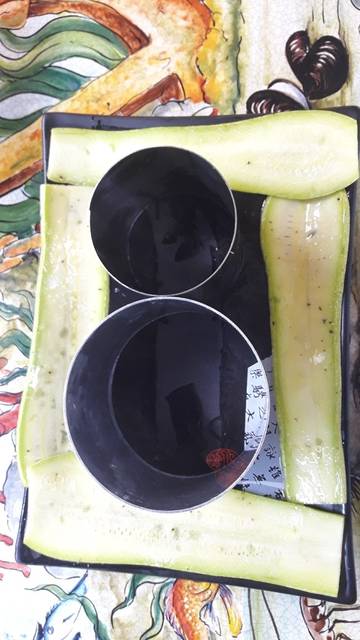 Disposez dans une assiette les tranches de courgettes marinées puis 2 cercles de pâtisserie de tailles différentes et composez le plat ainsi: