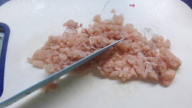 Hacher l’espadon au couteau. Mettez-le dans une assiette